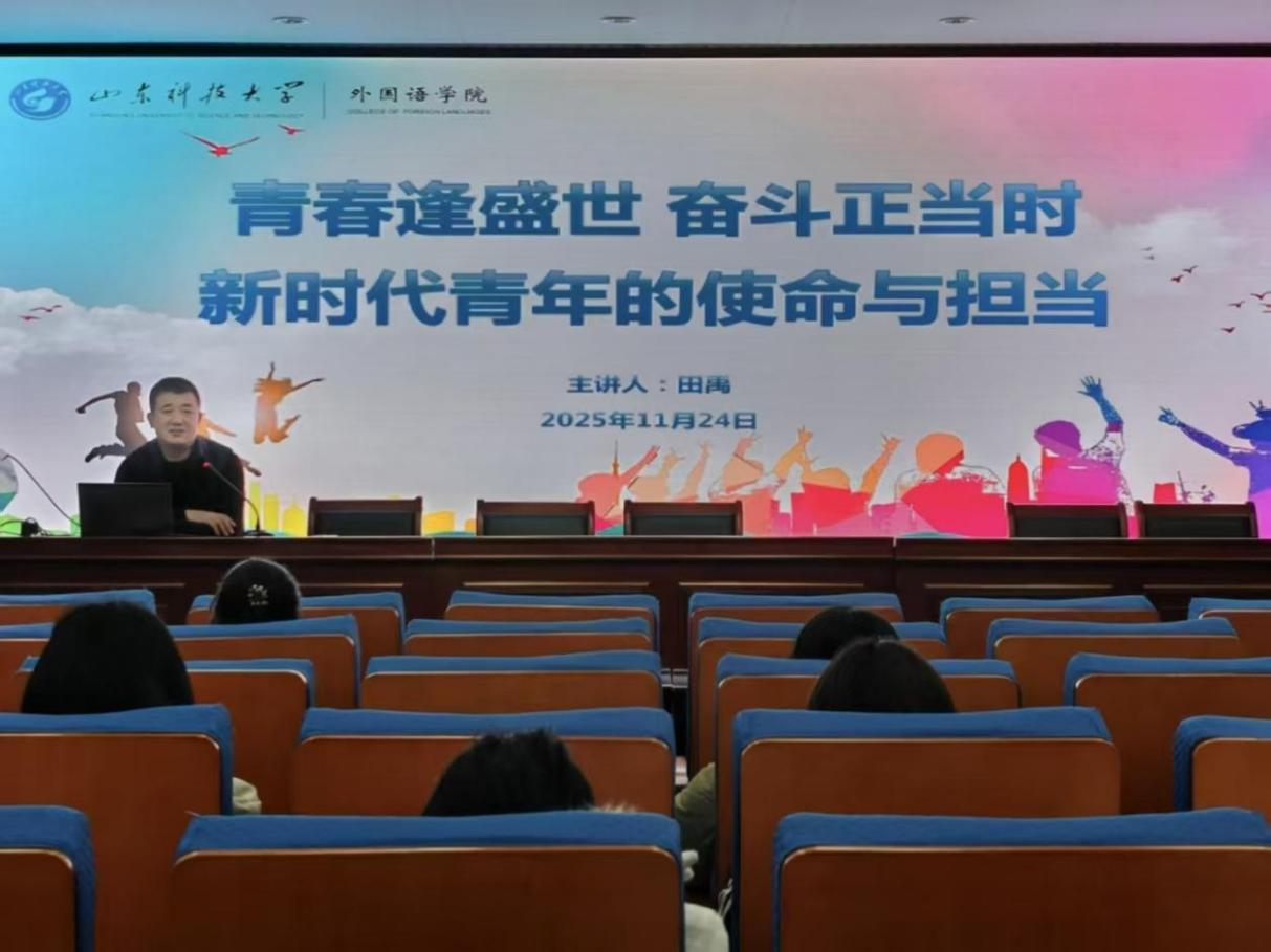 11月24日,外国语学院于J3-318会议室开展“青春逢盛世,奋斗正当时——新时代青年的使命与担当”主题团课。外国语学院团委书记、学生工作办公室主任田禹担任主讲人。