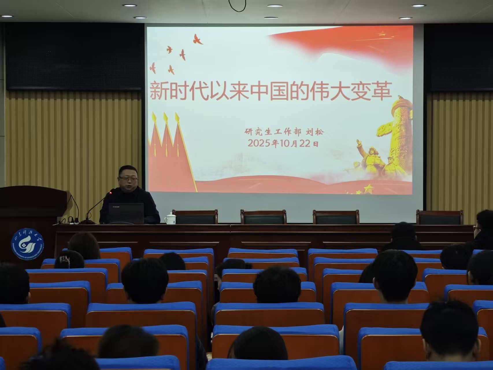 研究生院副院长、研究生工作部副部长刘松以“新时代以来中国的伟大变革”为主题,系统梳理了新时代以来中国共产党带领全国人民在经济发展、科技创新、脱贫攻坚、生态文明建设等诸多领域实现的伟大变革。刘松鼓励同学们在日常学习中开拓进取,守正创新,不断提升党性修养,锤炼过硬本领,争做新时代的优秀共产党员,为祖国的建设与发展贡献力量。