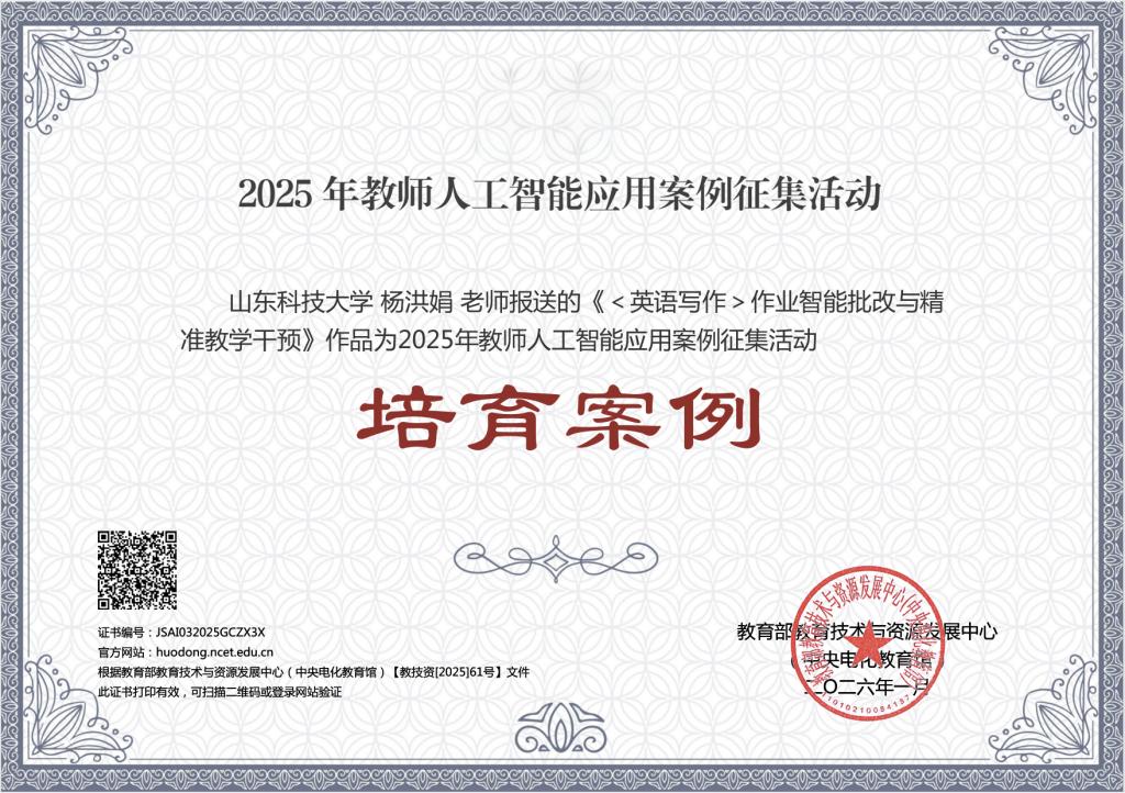 在2025年教师人工智能应用案例征集活动中,我院杨洪娟老师报送的作品《<英语写作>作业智能批改与精准教学干预》荣获培育案例。
