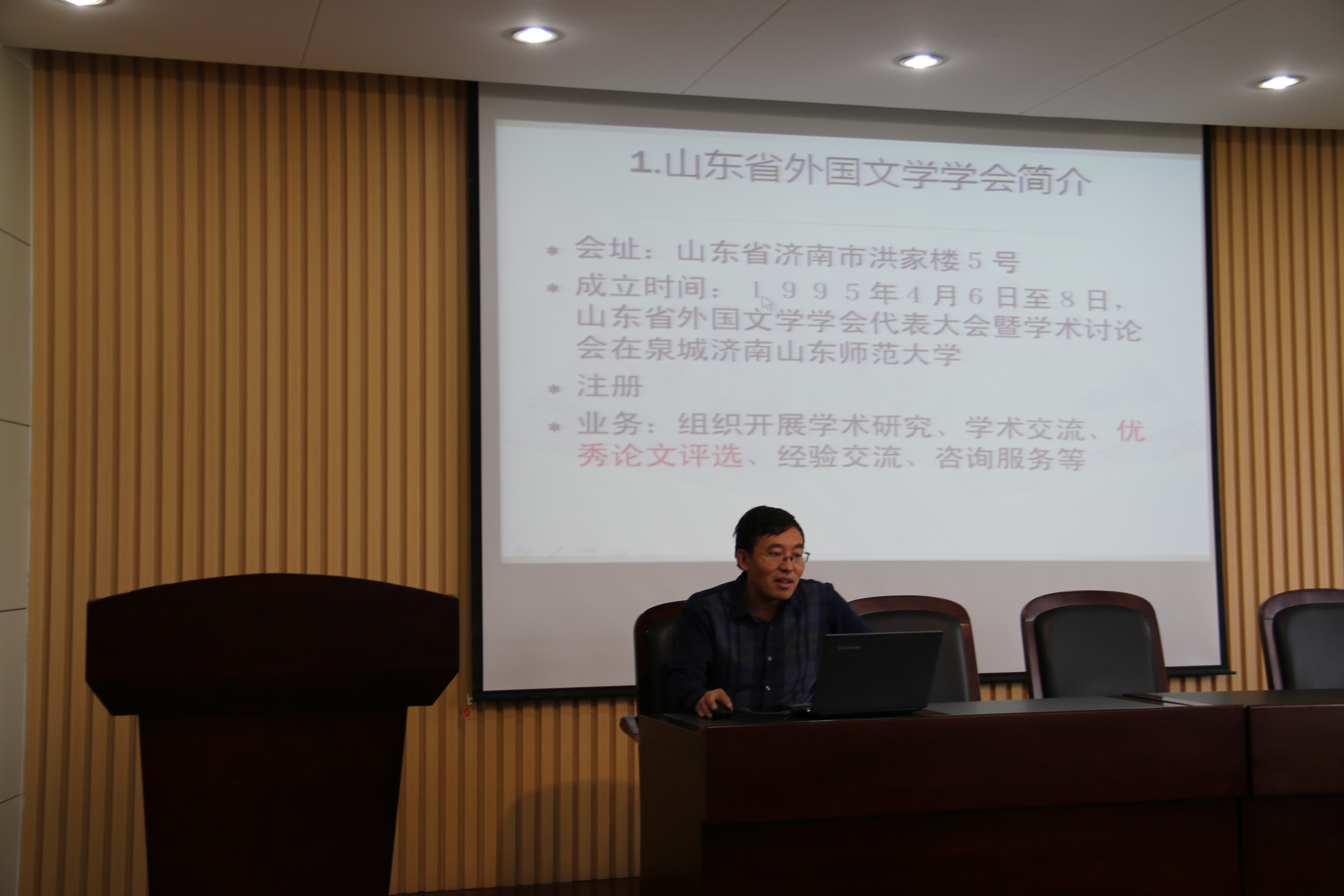 李庆学副教授为大家做了“山东省外国文学学会第十届年会简介”报告,将会上各位专家的主题发言分别进行讲解,并向大家传达了经典外国文学研究、现当代外国文学研究、比较文学研究等小组讨论的主要内容,使老师们对该领域的研究动向有了更好的了解与把握。