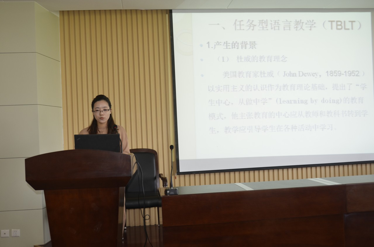 陈莹莹老师与刘德美老师分享了其最近进行的任务型教学方法的研究。陈老师首先从专家给出的定义的出发,帮助老师们对任务型教学有初步的认识,了解任务型教学的特点。在此基础上,陈老师又根据实际的例子引导大家判断什么是任务型教学,如何设计任务。刘德美老师则侧重讲解任务类型与任务的四大理论框架。两位老师的讲解互为补充,让在座老师从理论到实践对任务型教学有了初步的认识与把握。(通讯员:吕晓潇)