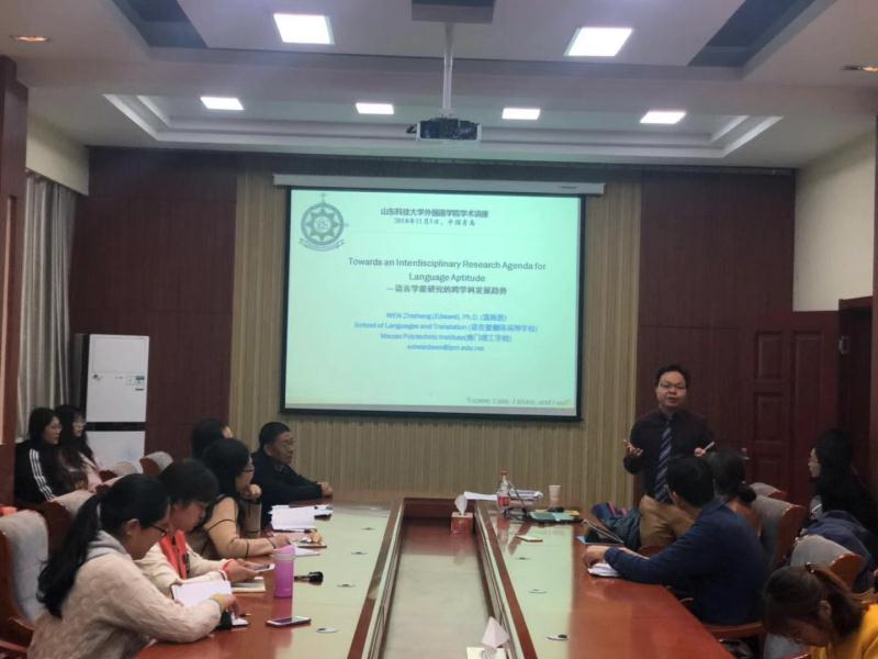 11月5日上午,澳门理工学院副教授温植胜应邀为我院师生做了一场题为《外语学能研究的跨学科发展与趋势》的学术讲座,讲座由外国语学院院长唐建敏主持。