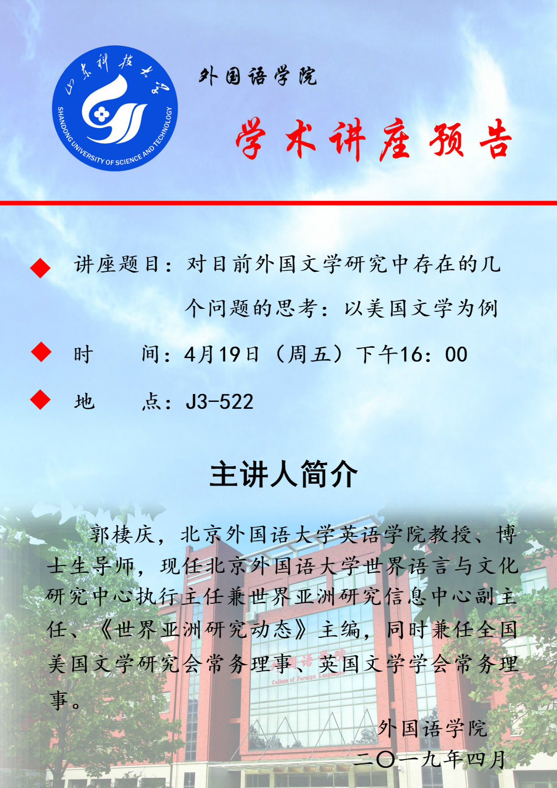 学术讲座预告:对目前外国文学研究中存在的几个问题的思考—以美国文学为例