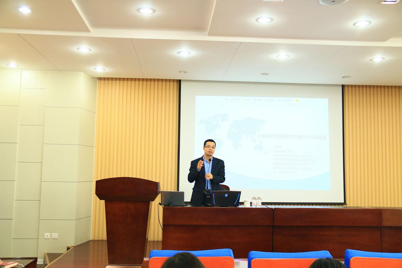王博士指出,在大数据时代,人工智能兴起,机器翻译迅速发展,数据爆发式增长,而现有的翻译研究和教育却没能跟上大数据时代的变化。他借助实例列举了新时代语言技术发展与教育技术的发展及影响,探讨了大数据驱动的外语与翻译教学,同时还现场演示了网络搜索技巧及本地化管理的方法,以及试译宝、智改等教学软件的使用方法。王博士在讲座中强调了当代教师所应具备的信息素养,认为翻译技术在语言服务中发挥着先导性和基础性作用,而数字化资源建设是外语翻译教育长足发展的基础,智能化技术必将深度融合于外语和翻译教学中。在这样的时代背景下,教师应积极投身翻译技术学习、探索智能教学新理念,多和社会、协会以及政府接触,不断开拓技术创新的方式,加强校企合作,用生态视角考虑翻译创新的途径。