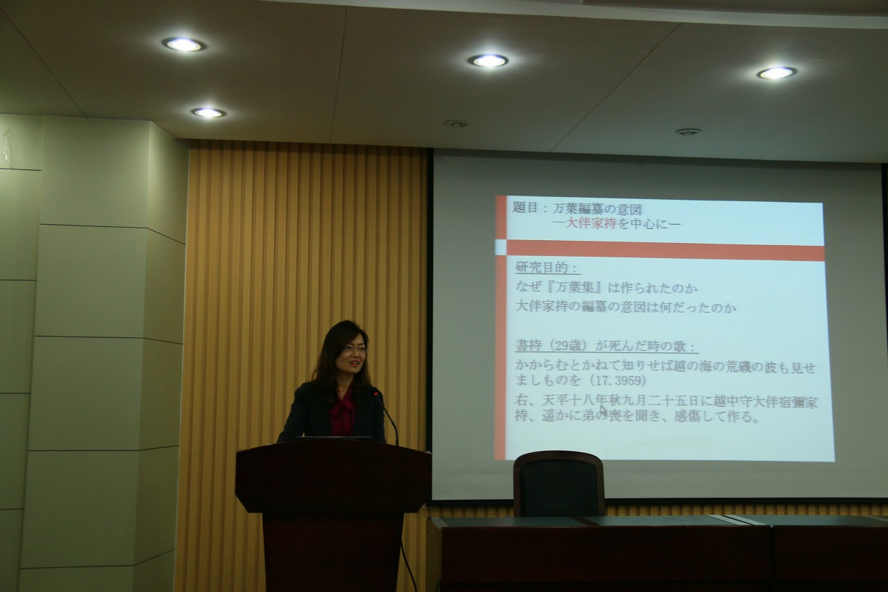 李成爱老师分享的是在鲁东大学举办的“第一届东亚日本学研究国际研讨会”的会议情况。大会的主要议题为“东亚地区日本学研究的动态与发展”,参加人员有来自日本,韩国和国内的有关研究人员及大学教师,其中不乏著名学者。研讨会中,学者们分别介绍了在东亚的《日本学》发展情况;东亚的姓氏,族谱的对比研究;《万叶集》撰写意图等内容。李老师表示此次国际研讨会与以往的研讨会不同,涉及到的领域相对广泛,通过研讨会不仅了解到了东亚地区的有关日本学方面的内容,在分科发表会上的发表也得到了专家、同行们的指导意见,对今后的研究有很大的帮助。