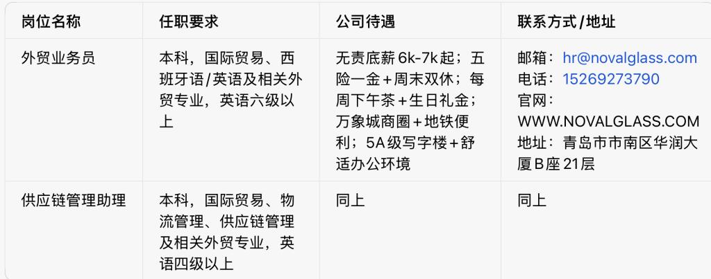 二、补充说明 •两个岗位共享同样的薪资福利与办公地点信息。 •外贸业务员对英语水平要求更高(六级),专业范围也更偏向语言类+外贸类;供应链助理对英语要求为四级,专业更偏向物流、供应链方向。三、联系方式 •邮箱:hr@novalglass.com •电话:15269273790 •地址:青岛市市南区华润大厦B座21层