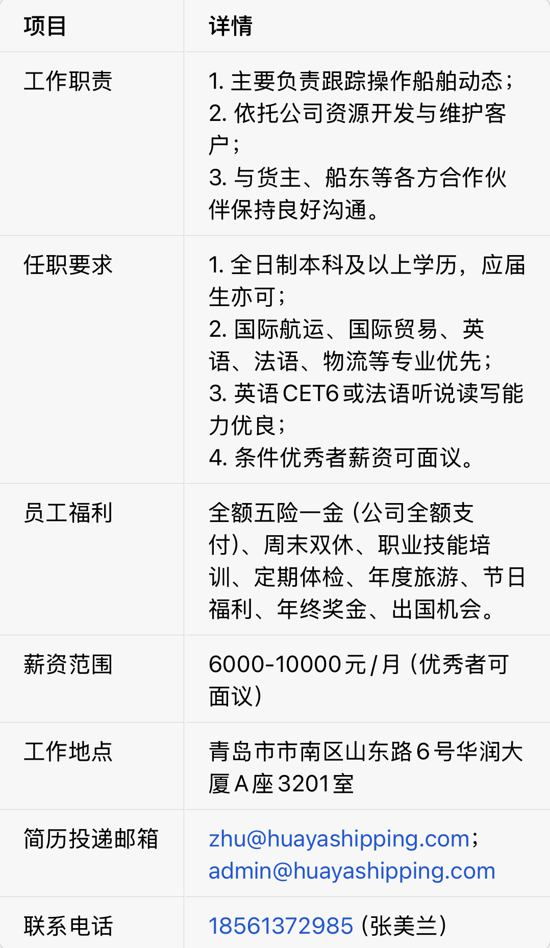三、 补充说明 该招聘信息为海运相关岗位,对语言能力和航运相关专业背景有一定偏好,福利条件较为完善,适合应届生或有相关从业经验的人员。